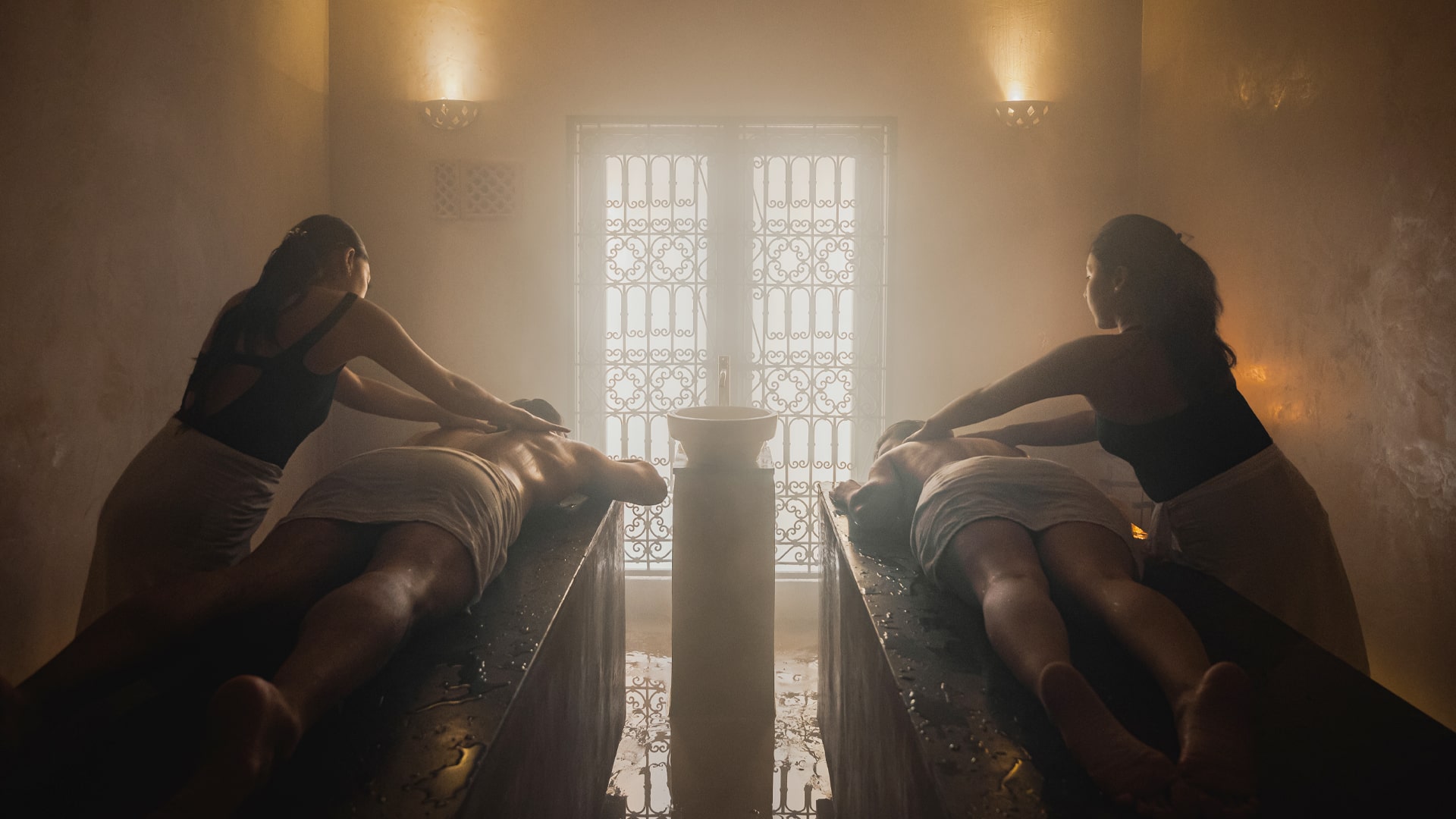 Relajación integral: Los vapores del hammam no solo calman la mente, sino que también relajan profundamente la musculatura, aliviando tensiones acumuladas.